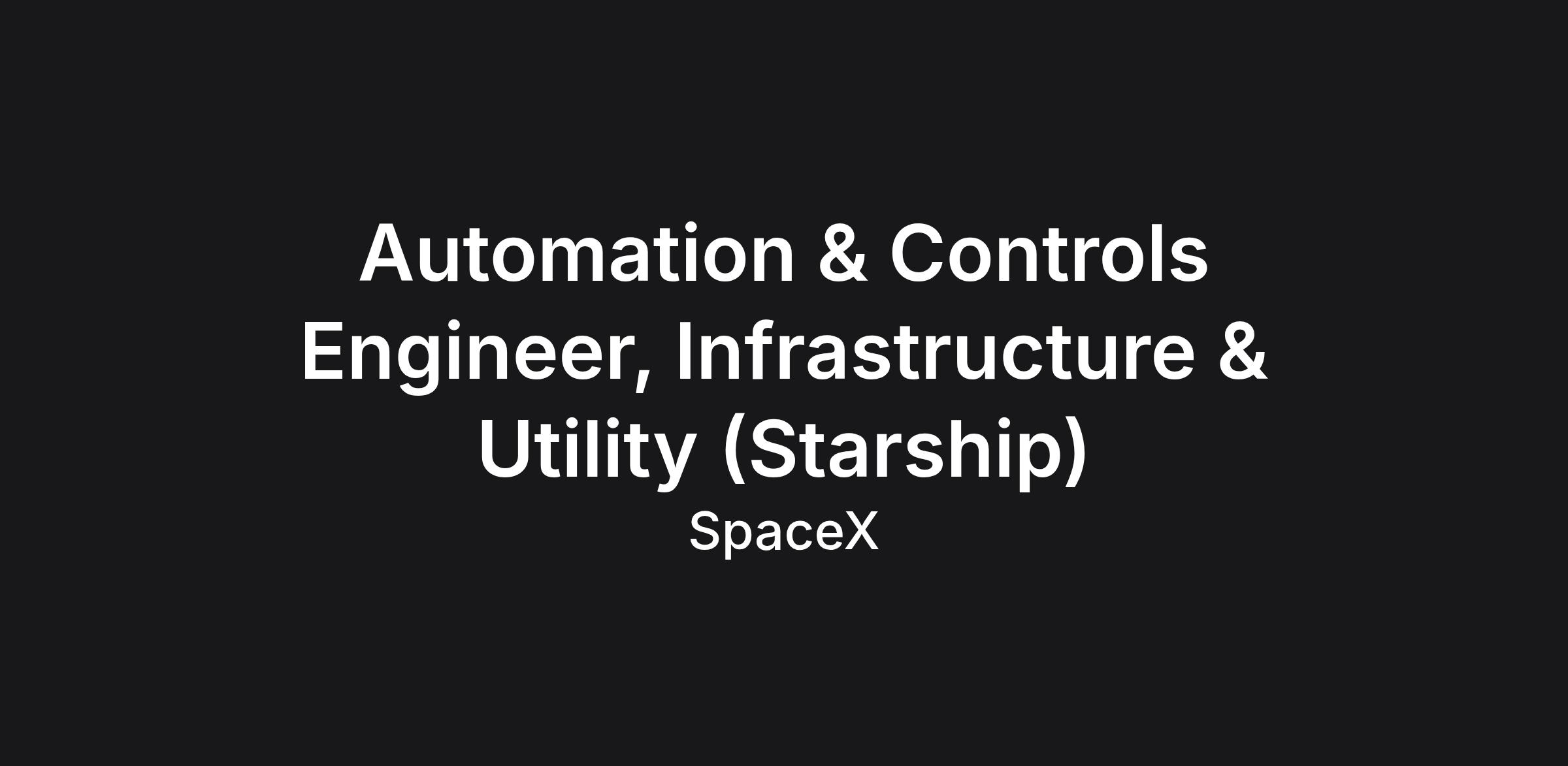SpaceX was founded under the belief that a future where humanity is out exploring the stars is fundamentally more exciting than one where we are not. Today SpaceX is actively developing the technologies to make this possible, with the ultimate goal of enabling human life on Mars. AUTOMATION AND CONTROLS ENGINEER, INFRASTRUCTURE & UTILITY (STARSHIP) Join the Infrastructure Engineering team at SpaceX to pioneer the design, build, operation, and maintenance of critical power, HVAC, utility and fluids systems for Starship's launch, production, propellant generation, and the city of Starbase, TX. As a engineer, you'll work with a team to scale high-capacity infrastructure for the world's most powerful rocket, ensuring seamless energy and commodity for groundbreaking missions. The position is based at Starbase, TX, with potential travel to other SpaceX facilities.