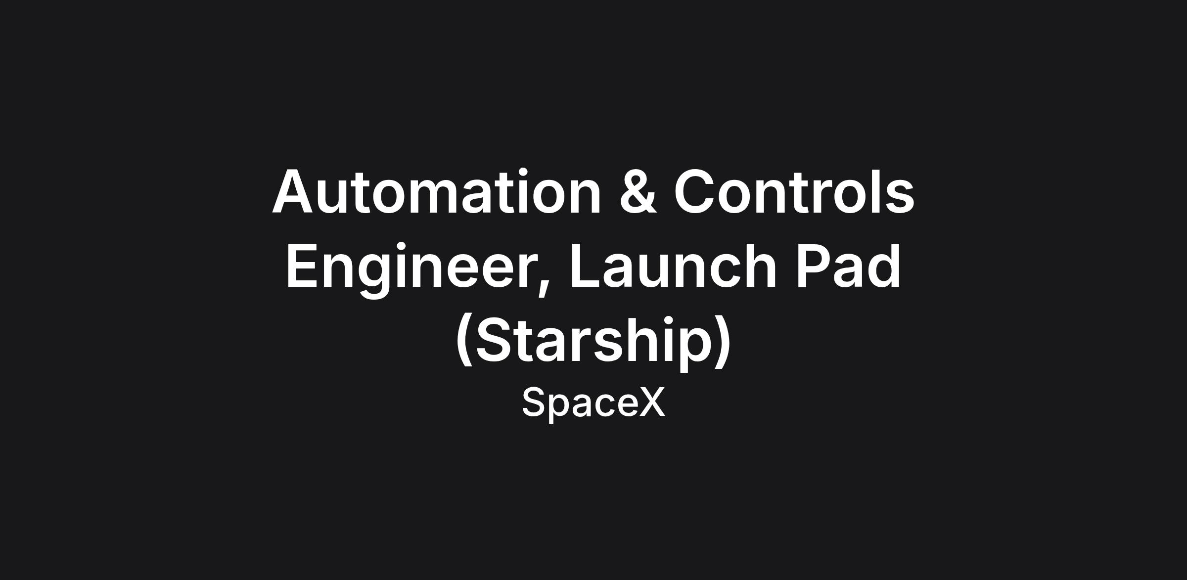 SpaceX was founded under the belief that a future where humanity is out exploring the stars is fundamentally more exciting than one where we are not. Today SpaceX is actively developing the technologies to make this possible, with the ultimate goal of enabling human life on Mars. AUTOMATION & CONTROLS ENGINEER, LAUNCH PAD (STARSHIP) SpaceX's Starship spacecraft and Super Heavy rocket (collectively referred to as Starship) represent a fully reusable transportation system designed to carry both crew and cargo to Earth orbit, the Moon, Mars and beyond. Starship will be the world's most powerful launch vehicle ever developed, with the ability to carry in excess of 100 metric tons to Earth orbit. We are looking for an automation & controls engineer to help SpaceX develop and build launch systems for Starship. This role will be focused on electrical control systems for the launch mount and integration tower, including I/O systems, motion systems, and supporting infrastructure. The successful applicant will be joining, and be supported, by a highly talented team of engineers with an amazing track record in developing any type of automated solution imaginable.