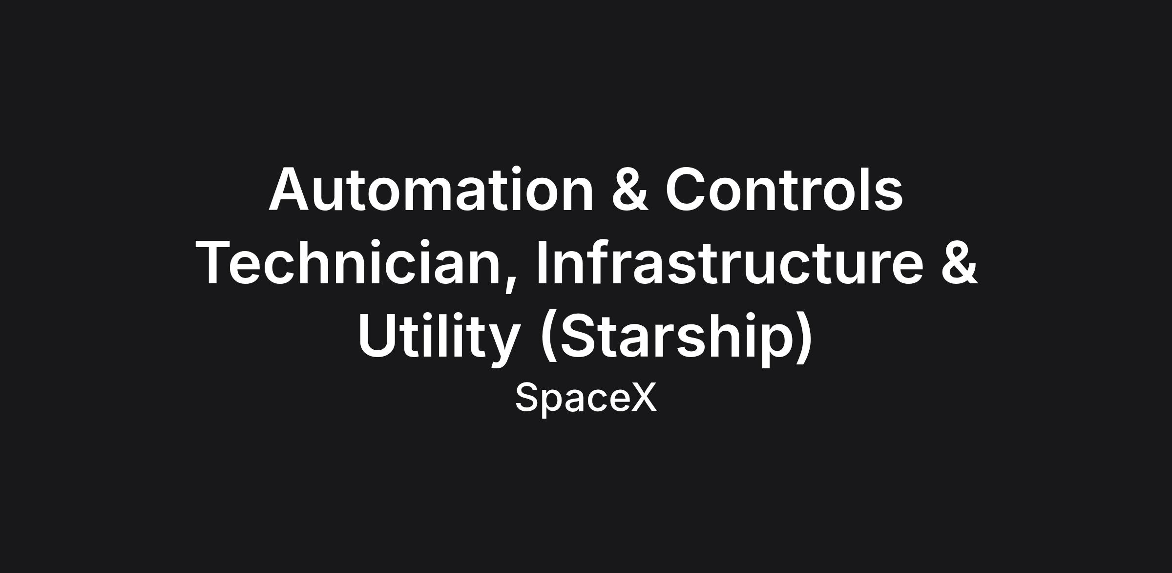 SpaceX was founded under the belief that a future where humanity is out exploring the stars is fundamentally more exciting than one where we are not. Today SpaceX is actively developing the technologies to make this possible, with the ultimate goal of enabling human life on Mars. AUTOMATION AND CONTROLS TECHNICIAN, INFRASTRUCTURE & UTILITY (STARSHIP) Join the Infrastructure Engineering team at SpaceX to pioneer the design, build, operation, and maintenance of critical power, HVAC, utility and fluids systems systems for Starship's launch, production, propellant generation, and the city of Starbase, TX. As a technician, you'll work with a team to scale high-capacity infrastructure for the world's most powerful rocket, ensuring seamless energy and commodity for groundbreaking missions. The position is based at Starbase, TX, with potential travel to other SpaceX facilities.