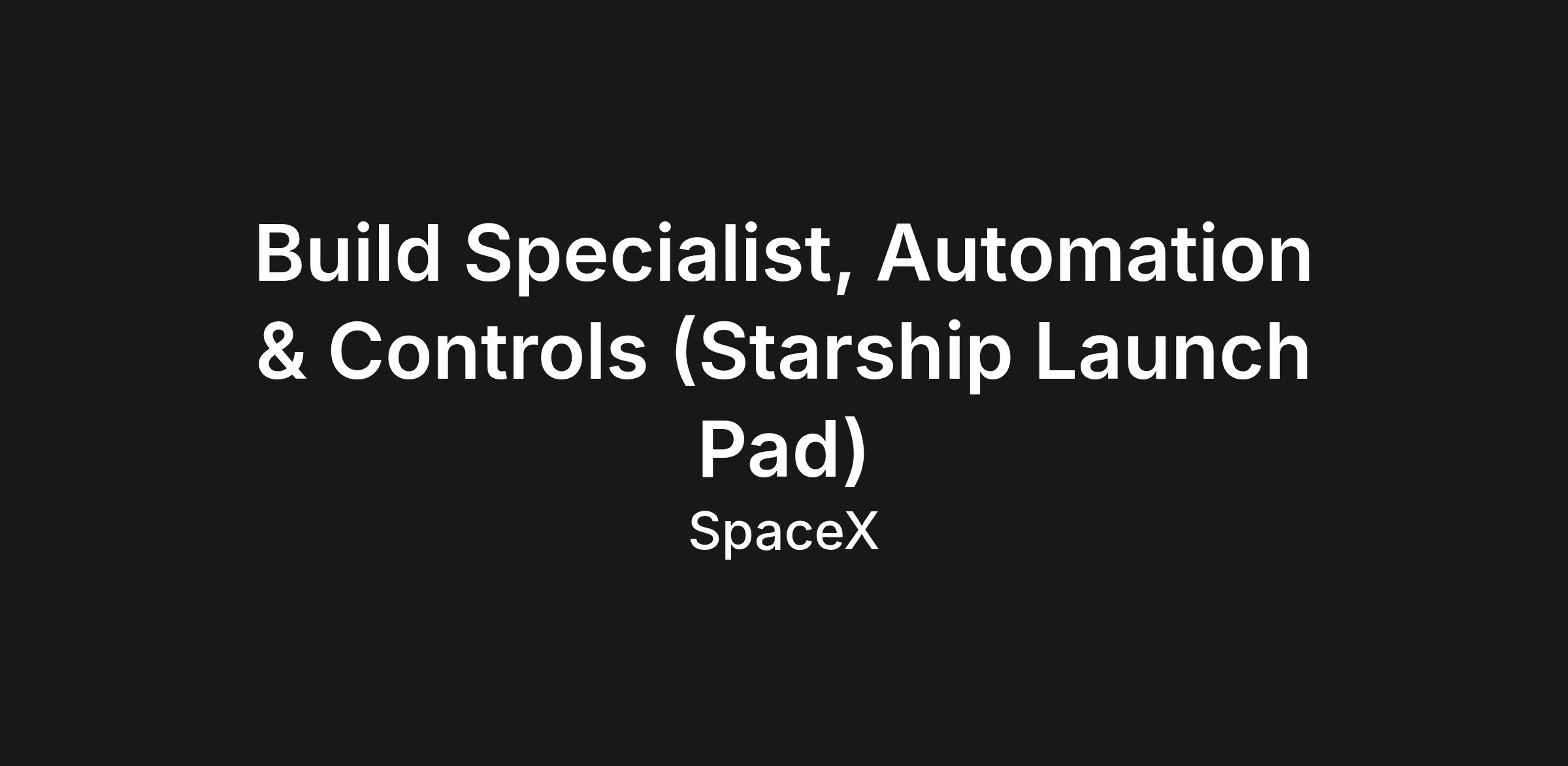 SpaceX was founded under the belief that a future where humanity is out exploring the stars is fundamentally more exciting than one where we are not. Today SpaceX is actively developing the technologies to make this possible, with the ultimate goal of enabling human life on Mars. BUILD SPECIALIST, AUTOMATION & CONTROLS (STARSHIP LAUNCH PAD) The Starship Tower & Launch Mount team is looking for controls build specialists to help make the next generation of launch pads a reality. This role will be focused on bridging the gap between detailed design and activations – that is, developing planning for installing conveyances and pulling cables, building up a healthy supply chain of commonly used parts, assisting in the field as needed, and feeding back lessons learned from the build to the design team. The systems the group is developing are intended to interface with the next generation of Starship vehicles, catch both stages, and enable a rapid and automated flight cadence requiring no manual actions between launches.