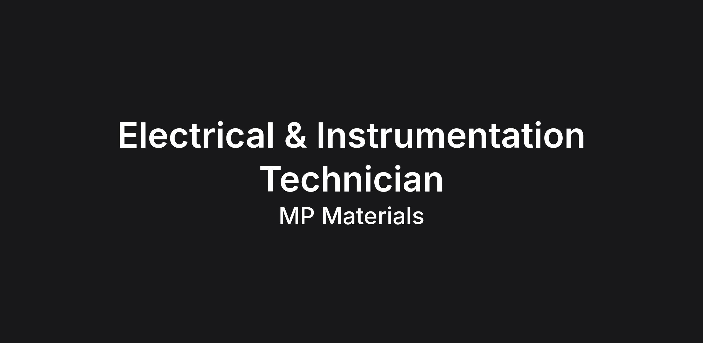 Desired Qualities: Experience with Allen‑Bradley, Emerson, Siemens, Foxboro, or Yokogawa systems. State or journeyman electrical certification. Instrumentation certification (ISA, NCCER, etc.). Experience in hazardous locations (Class I/Division 2, etc.). NFPA 70E Training. MP Materials is Proud to be an Equal Opportunity / Affirmative Action Employer All qualified applicants will receive consideration for employment without regard to race, color, religion, sex, sexual orientation, gender identity, national origin, disability, protected veteran status, or any other characteristic protected by law. Underrepresented groups/Women/Disabled/Veterans are encouraged to apply. Candidates whose disabilities make them unable to meet the position's requirements will still be considered qualified if they can perform the essential functions of the job with reasonable accommodation. Your Right to Work – In compliance with federal law, all persons hired will be required to verify identity and eligibility to work in the United States and to complete the required employment verification document form upon hire. For Assistance with Application - Alternative methods of applying for employment are available to individuals unable to submit an application through this site because of a disability. Contact Human Resources Department at 702-844-6111; dial 7 when prompted for HR; 1700 South Pavilion Center Dr. 8th Floor, Las Vegas, NV 89135 to discuss reasonable accommodation. Safety Provision - Employees are responsible for following all company, industry and regulatory procedures and laws to ensure a safe work environment for themselves and the company. Employees must have a willingness to promote safety among the workforce, participate in Process Hazard Analysis procedures and Pre-Startup Safety Reviews. (PPE) Personal Protective Equipment is required when performing work in a mine, manufacturing, outdoor, or plant environment. Required PPE may include, but is not limited to, hard hat, hearing protection, safety glasses, safety footwear, respirator, rubber steel-toe boots, protective clothing, gloves, and any other protective equipment as required. Working Conditions - Our facility sits at an elevation of 4,700 feet. Employees may be subject to extreme weather conditions when working in an outdoor setting (heat and cold, wind). Work is at an open pit mine or manufacturing/chemical plant setting, which may include exposure to moving mechanical parts, toxic chemicals, risk of electrical shock, explosives, fumes, or airborne particles. Physical Demands - Manual dexterity; sense of touch; sense of smell; speaking clearly; hearing-speech range; hearing – all ranges; seeing, reading and comprehensions; seeing – distant/near; depth perception; color vision. While performing the job responsibilities, the employee is required to talk and hear. The employee is often required to stand and use their hands and fingers, to handle or feel and to manipulate laboratory equipment. The employee is occasionally required to walk, reach with arms and hands, climb or balance, and to stoop, kneel, crouch or crawl. Vision abilities required by this job include close vision. Employees must pass a full-face respiratory fit test. Employees must be able to lift 50 lbs. Must be able to work in PPE level C. These requirements are representative, but not all-inclusive, of the knowledge, skill, and ability required of the employee.