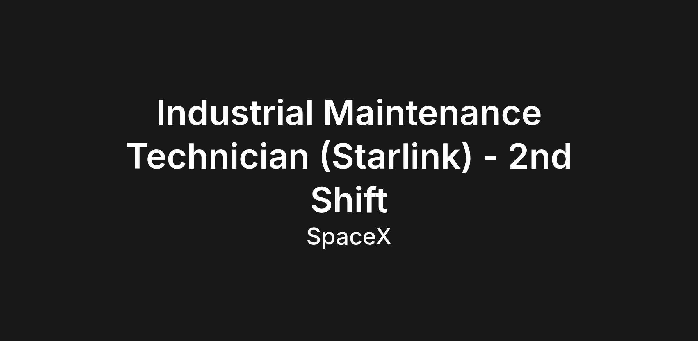 SpaceX was founded under the belief that a future where humanity is out exploring the stars is fundamentally more exciting than one where we are not. Today SpaceX is actively developing the technologies to make this possible, with the ultimate goal of enabling human life on Mars. INDUSTRIAL MAINTENANCE TECHNICIAN (STARLINK) - 2ND SHIFT The Industrial Maintenance Technician at SpaceX works in a fast-paced environment that will oversee the installation and maintenance of our heavy industrial equipment such as cranes, compressed air systems, and overhead doors by third-party contractors to support the production of Starlink. This role will also be responsible for ensuring the smooth operation of our machinery and mechanical equipment as well as installing new equipment, performing regular services, performing maintenance procedures, and troubleshooting equipment breakdowns. As an Industrial Maintenance Technician, you will use all the tools at your disposal to ensure reliability of the industrial equipment and any associated support equipment. This will involve corrective, preventive, and predictive maintenance techniques, as well as operational and design feedback for maintaining and improving all systems at Starlink facilities.