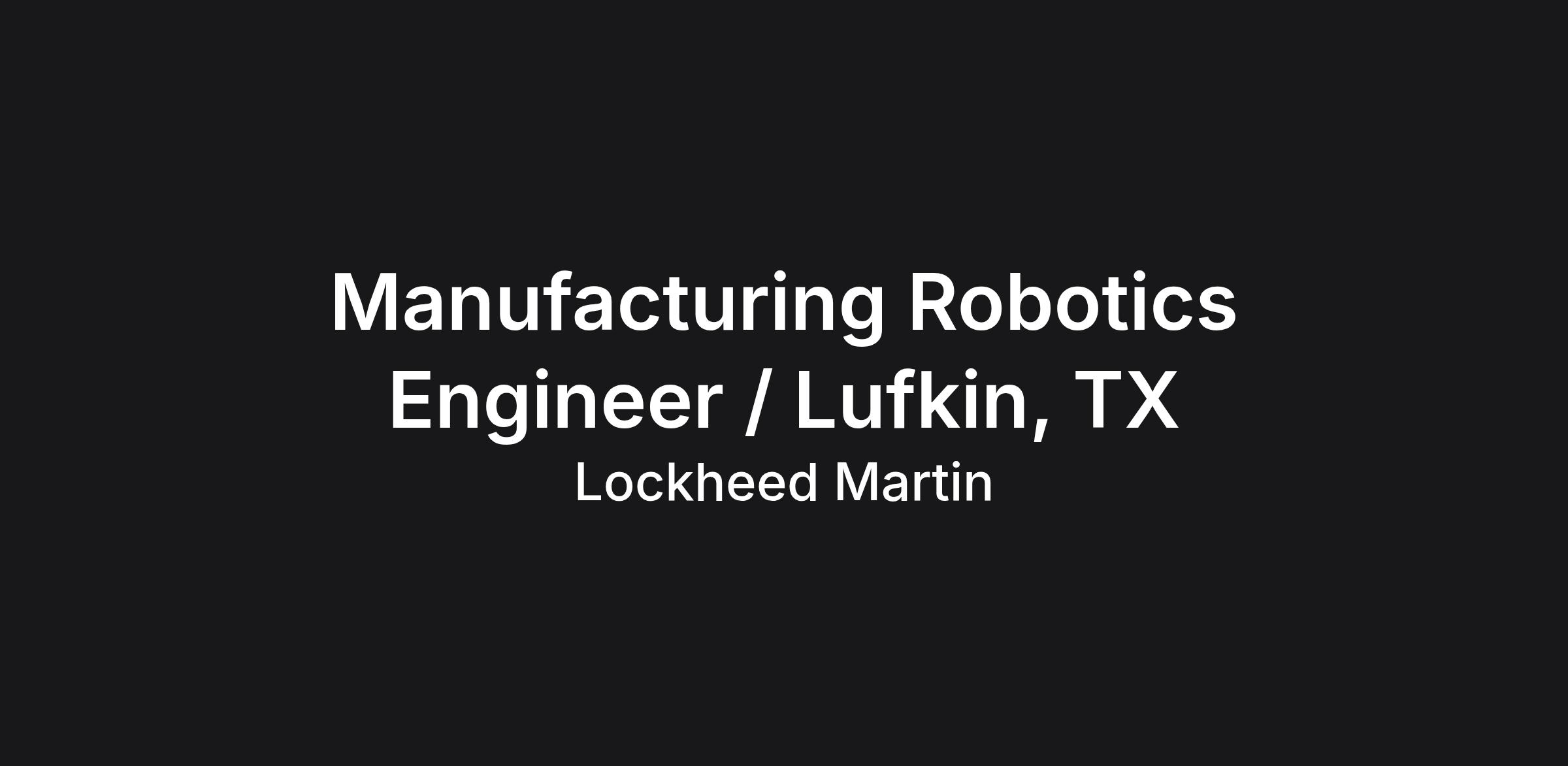 Why Join Us We are looking for a collaborative and innovative Manufacturing Robotics Engineer who is passionate about automation and robotics. You will have the opportunity to work on challenging projects, develop your skills, and contribute to the growth and success of our team. If you are driven, dedicated, and enjoy working in a fast-paced environment, then we want you to join our journey. We are committed to supporting your work-life balance and overall well-being, offering flexible scheduling options Learn more about Lockheed Martin’s comprehensive benefits package here. Further Information About This Opportunity: This position is in Lufkin. Discover more about our Lufkin, Texas location. MUST BE A U.S. CITIZEN - This position is located at a facility that requires special access. The selected candidate must be able to obtain a secret clearance