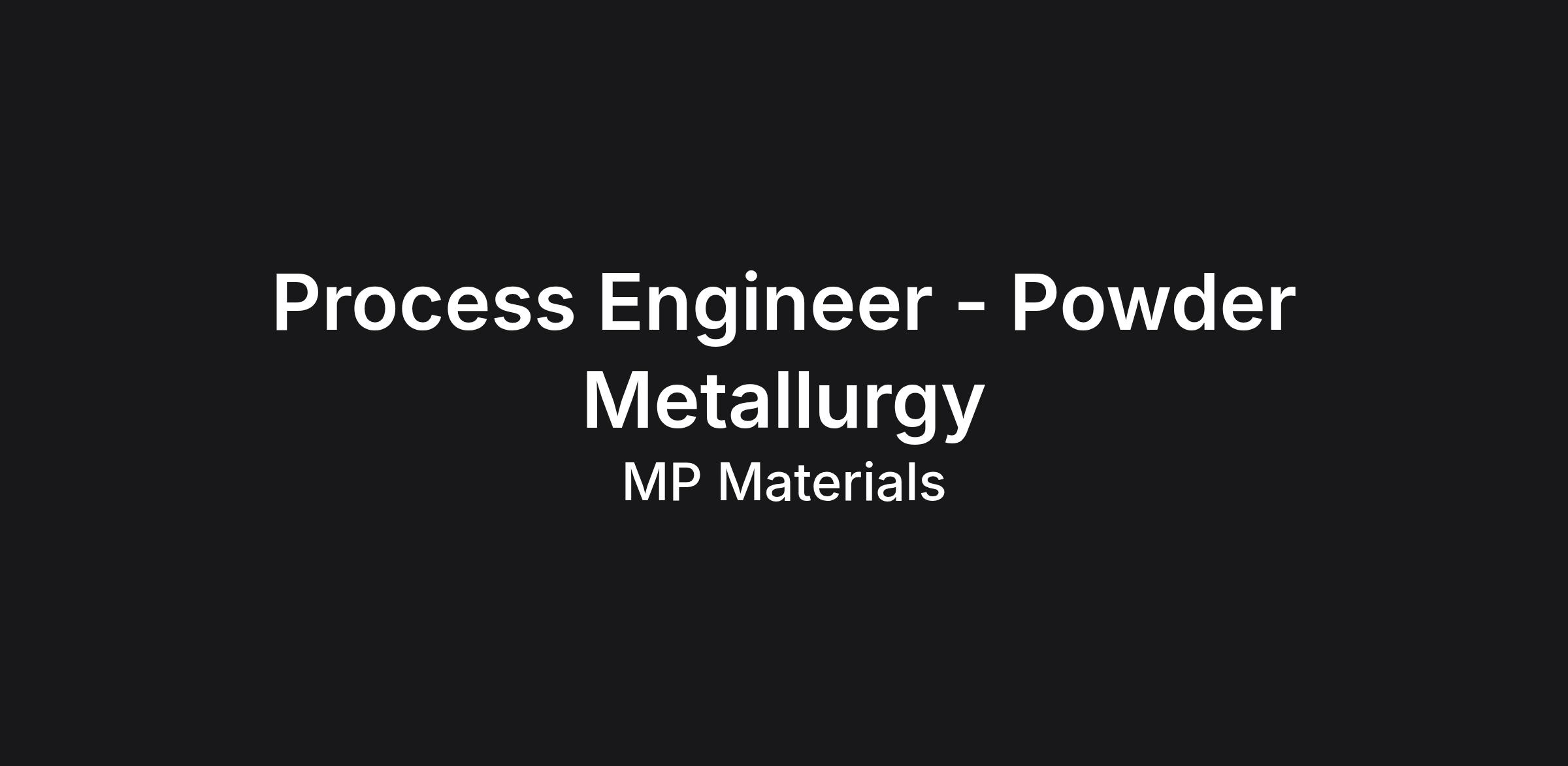 Desired Qualifications: 5+ years of experience of industrial experience powder manufacturing, processing, and/or conducting powder metallurgy processes. Deep technical knowledge of metal powder pulverization and hydrogen furnace operation. Practical experience of the process safety associated with metal powder processing. Experience with SAP. Ability to identify and solve problems and convince others (management down to operators) that your solution is the right one. Experience with programming, and process control operations; P&ID, PLC, CFD, MATLAB, Python, Mini -Tab, AutoCAD/Solidworks. MP Materials is Proud to be an Equal Opportunity / Affirmative Action Employer All qualified applicants will receive consideration for employment without regard to race, color, religion, sex, sexual orientation, gender identity, national origin, disability, protected veteran status, or any other characteristic protected by law. Underrepresented groups/Women/Disabled/Veterans are encouraged to apply. Candidates whose disabilities make them unable to meet the position's requirements will still be considered qualified if they can perform the essential functions of the job with reasonable accommodation. Your Right to Work – In compliance with federal law, all persons hired will be required to verify identity and eligibility to work in the United States and to complete the required employment verification document form upon hire. For Assistance with Application - Alternative methods of applying for employment are available to individuals unable to submit an application through this site because of a disability. Contact Human Resources Department at 702-844-6111; dial 7 when prompted for HR; 1700 South Pavilion Center Dr. 8th Floor, Las Vegas, NV 89135 to discuss reasonable accommodation.
