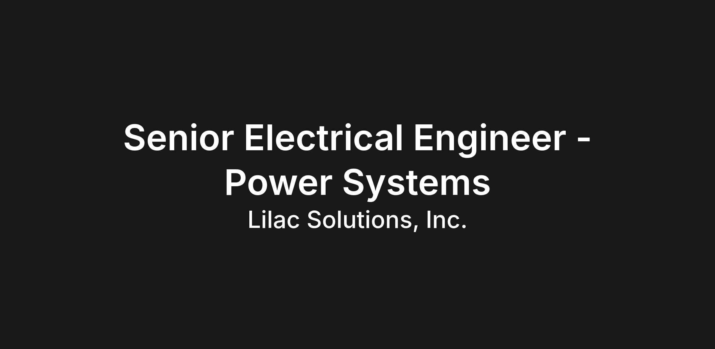Senior Electrical Engineer - Power Systems Senior Electrical Engineer - Power Systems About Lilac Solutions, Inc. Lilac exists to solve one problem: lithium supply. By engineering scalable lithium extraction technology, we help industries produce lithium faster, cheaper, and cleaner. Our ion exchange technology is rooted in scientific precision and commercial know-how, making lithium supply a non-issue for global electrification. Our materials, engineering, and approach uniquely position us to design and develop commercial projects across various lithium sources. We help lithium producers rapidly and responsibly scale production from brine resources with versatile, cost-effective, and dynamic technology solutions.