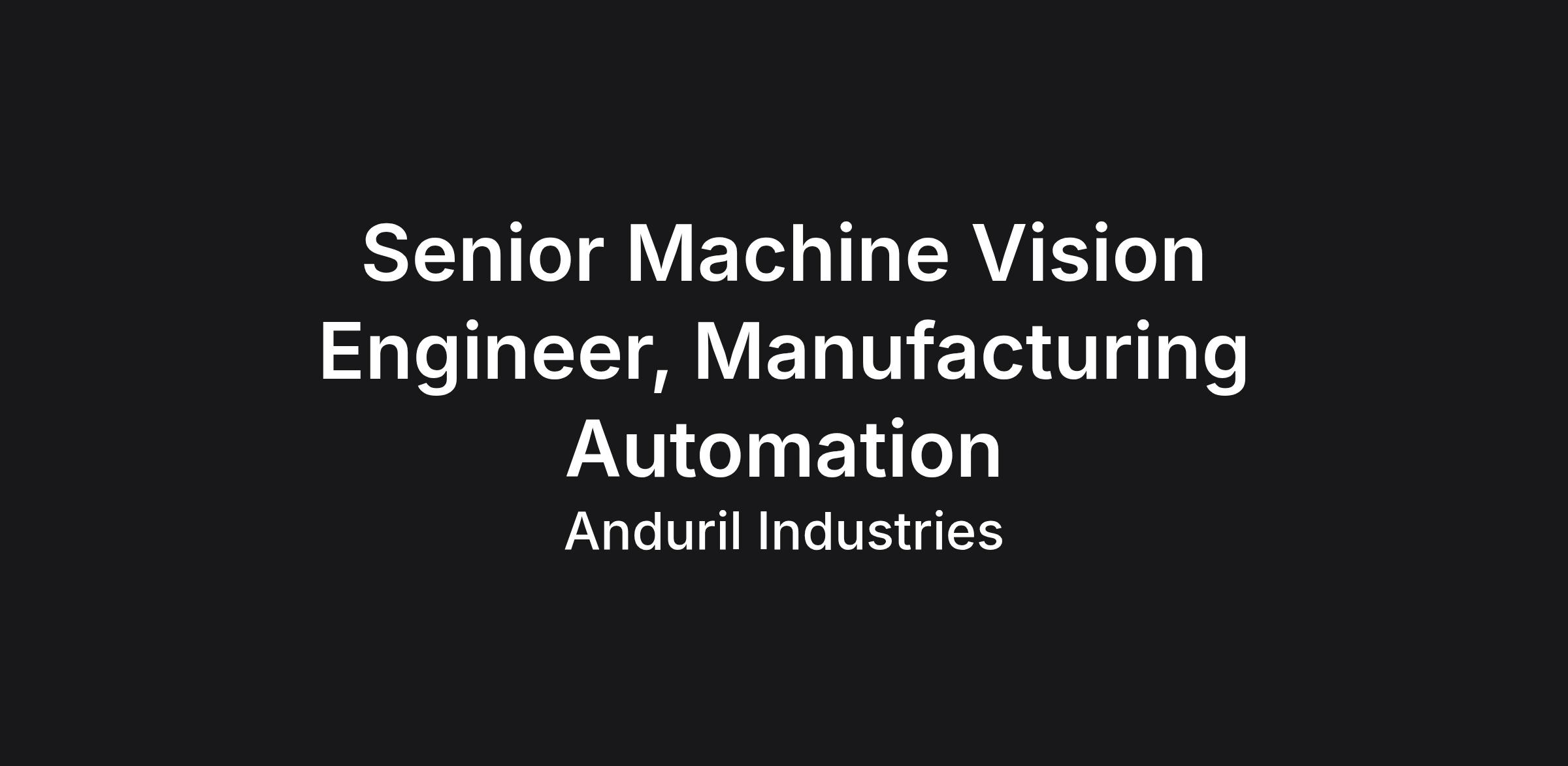 Anduril Industries is a defense technology company with a mission to transform U.S. and allied military capabilities with advanced technology. By bringing the expertise, technology, and business model of the 21st century’s most innovative companies to the defense industry, Anduril is changing how military systems are designed, built and sold. Anduril’s family of systems is powered by Lattice OS, an AI-powered operating system that turns thousands of data streams into a realtime, 3D command and control center. As the world enters an era of strategic competition, Anduril is committed to bringing cutting-edge autonomy, AI, computer vision, sensor fusion, and networking technology to the military in months, not years. ABOUT THE TEAM Anduril’s Manufacturing Automation team is seeking a Senior Machine Vision Engineer to join our team. The Manufacturing Automation team is responsible for the design, integration, and deployment of automated manufacturing systems across Anduril factories. As a member of this team, you will have the opportunity to help define what production automation looks like for Anduril at a national scale. WHAT YOU'LL DO Develop and implement machine vision for automation systems, quality inspection, defect detection, and process monitoring Specify, procure, validate, and sustain vision system components including cameras, lenses, lighting, controllers, and software Oversee the installation, validation, and commissioning of vision systems in production environments across multiple product lines Collaborate with cross-functional teams to integrate high-precision inspection systems into production lines and automation systems Lead efforts into RCCA on vision systems and process failures Train production staff on the operation and maintenance of vision systems REQUIRED QUALIFICATIONS Bachelor's degree in Robotics, Computer Science, Electrical Engineering, or similar 4+ years of experience in developing and maintaining vision systems in a manufacturing environment Demonstrated experience developing vision system platforms (Cognex, Keyence, iRVision, Halcon) and programming languages (Python, C++, OpenCV) Strong understanding of image processing algorithms, optics, and lighting principles Hands-on experience with industrial automation systems including PLC / robot integration Familiarity with advanced defect detection techniques, AI-based vision systems, and SPC methodologies PREFERRED QUALIFICATIONS Active Secret or Top Secret Clearance US Salary Range $146,000 - $194,000 USD The salary range for this role is an estimate based on a wide range of compensation factors, inclusive of base salary only. Actual salary offer may vary based on (but not limited to) work experience, education and/or training, critical skills, and/or business considerations. Highly competitive equity grants are included in the majority of full time offers; and are considered part of Anduril's total compensation package. Additionally, Anduril offers top-tier benefits for full-time employees,