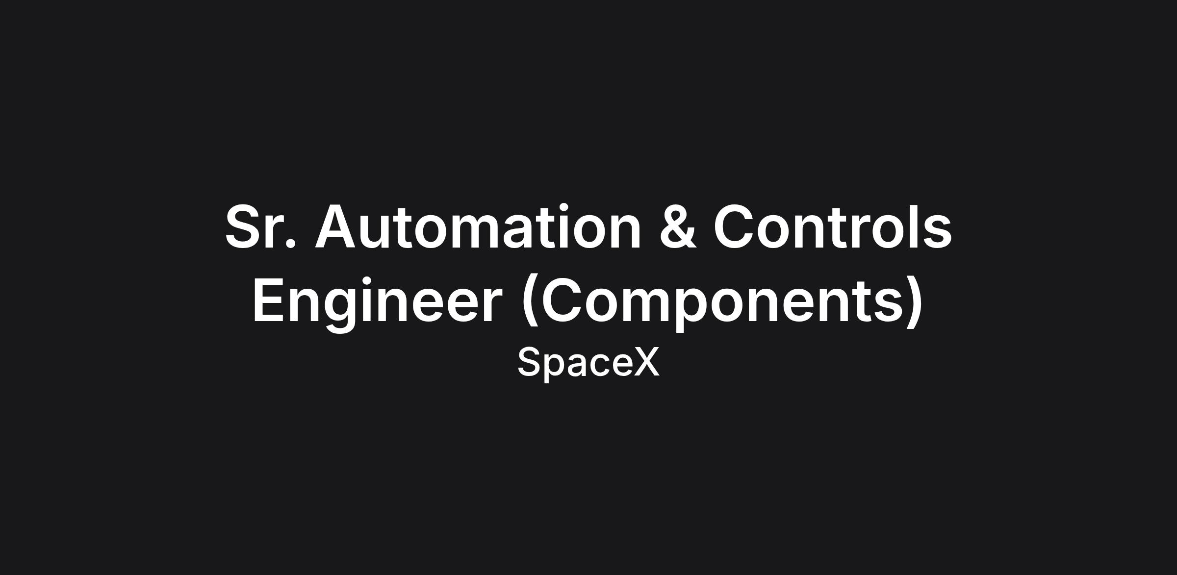 SpaceX was founded under the belief that a future where humanity is out exploring the stars is fundamentally more exciting than one where we are not. Today SpaceX is actively developing the technologies to make this possible, with the ultimate goal of enabling human life on Mars. SR. AUTOMATION & CONTROLS ENGINEER (COMPONENTS) SpaceX's Starship spacecraft and Super Heavy booster (collectively referred to as Starship) represent a fully reusable transportation system designed to carry both crew and cargo to Earth orbit, the Moon, Mars and beyond. Starship will be the world's most powerful launch vehicle ever developed, with the ability to carry in excess of 100 metric tons to Earth orbit. We are looking for an automation & controls engineer to help SpaceX develop and build a great variety of automated solutions for Starship Production. This role will be hands-on in designing and activating hardware and software systems for the machines that make up the Starship production and machining line.