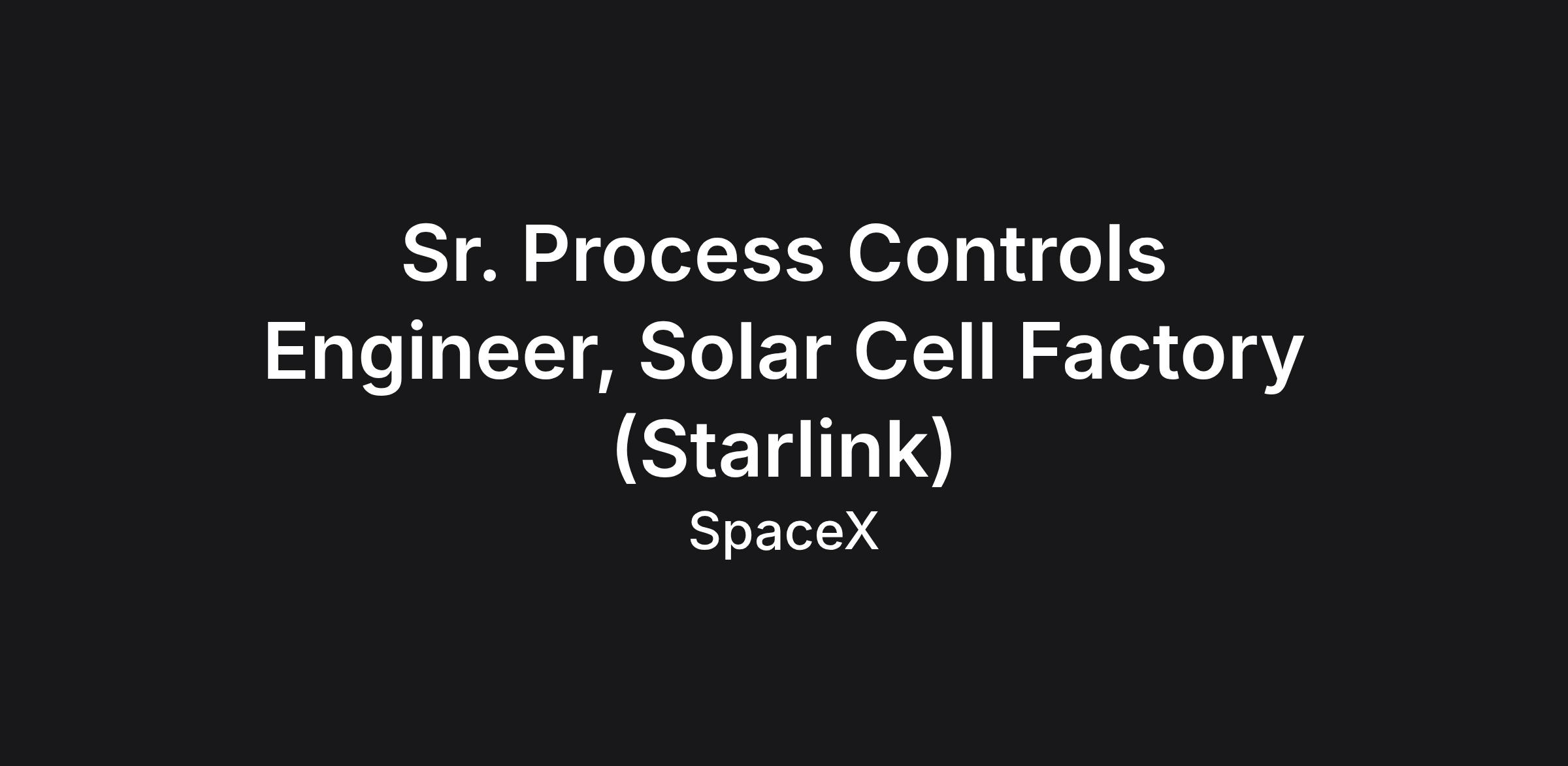 SpaceX was founded under the belief that a future where humanity is out exploring the stars is fundamentally more exciting than one where we are not. Today SpaceX is actively developing the technologies to make this possible, with the ultimate goal of enabling human life on Mars. SR. PROCESS CONTROLS ENGINEER, SOLAR CELL FACTORY (STARLINK) The Solar Cell team is revolutionizing power generation for space applications through advanced solar cell manufacturing. We're scaling production of high-efficiency solar cells to support sustainable energy solutions for Starlink constellations, launch vehicles, and beyond. As a Sr. Process Controls Engineer, you will design, build, and optimize controls and automation systems for the delivery of critical gases and chemicals in solar cell fabrication. This role requires a detail-oriented engineer passionate about safe handling of hazardous materials in a high-volume manufacturing environment, ensuring reliable control code and safe instrumentation and design of processes like vacuum deposition and etching while minimizing risks and maximizing efficiency in our cutting-edge solar cell factory.